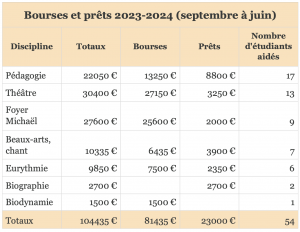 De septembre 2023 à juin 2024, la Fondation a soutenu dix-sept étudiants en pédagogie Waldorf, treize étudiants en théâtre, neuf étudiants au Foyer Michaël, sept en arts plastiques et chant, six en eurythmie, deux en biographie et un en biodynamie. Ce furent en tout cinquante-quatre étudiants, une personne ayant opté pour deux formations.