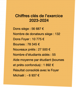 Pendant le nouvel exercice allant du 01/09/2023 au 31/08/2024, 78 345 € de bourses ont été versés à 46 étudiants. Des prêts ont été accordés pour 25 700 €, à 29 étudiants. En tout 55 étudiants ont été aidés, une étudiante ayant participé à deux formations. La Fondation a aussi soutenu 5 projets de formation ou à caractère artistique, pour un total de 5 420 €.